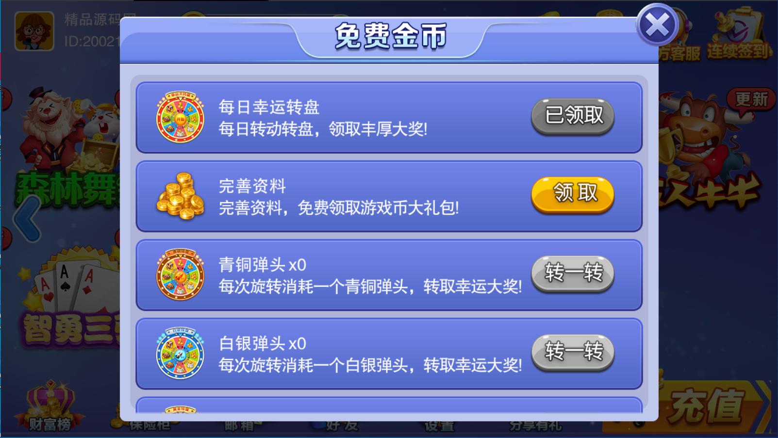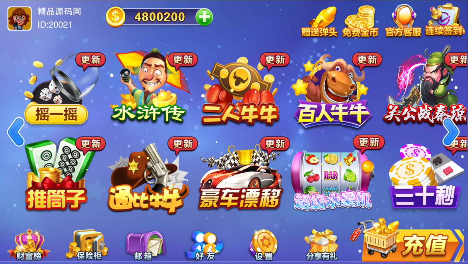 | 源码介绍: 游戏相当不错,站长亲自测试了下 功能都正常没啥问题 精美前端界面,子游戏众多,包括了拉霸类游戏,百人类游戏,捕鱼类游戏和棋牌类游戏,有智能陪玩机器人,代理系统,精准ID点控 亲测时顺便清除了程序中的后门文件和木马,并且录制了详细的搭建教程 整合修复优化了这套全新富贵3镜像,一键开通实例搭建部署,服务器环境什么的都搞好了,搭建起来非常方便 就算是刚入门的小白使用本站配套程序跟着本站教程,亦能成功搭建 平台共计43款子游戏: 拉霸类游戏:疯狂的7、武财神、疯狂的猴子、疯狂麻将、火焰连击、多财多福、财神赐福、上海百家门、五龙争霸、三只猴子、金龙献宝、黄金龙王、恭喜发财、金鸡报喜、水浒传 百人类游戏:红黑大战,龙虎斗,宝马游戏、六狮王朝、飞禽走兽、五星宏辉、金鲨银鲨、水果机、森林舞会、关公战秦琼、百人牛牛、百人乐、豪车漂移、摇一摇、推简子 捕鱼类游戏:神龙宝藏、摇钱树、李逵劈鱼、皇家礼炮、金蟾捕鱼、淡水鱼、海王2 扑克类游戏:跑得快,十三水,斗地主,智勇三张、二人牛牛、通比牛牛、斗牛 富贵3常用修改:: 富贵3修改LOGO路径:/assets/logo.png 富贵3修改IP文件:/assets/customerInfo.xml 富贵3头像路径:/assets/Head/目录下8个PNG头像资源 富贵3背景音乐:在热更新包:JJHall_111.zip,解压后替换/JJHall_111/Phone/Sounds/BGM1.u3d 亲测截图: |