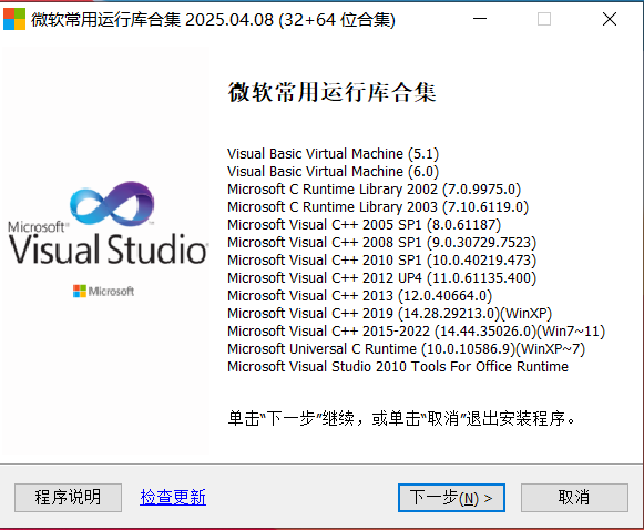 内含 MSVBCRT_AIO_2020.03.25_X86+X64.exe 和 MSVBCRT_AIO_2020.03.25_X86.exe 两个程序, 微软常用运行库合集32+64位合集 , vc运行库, 解决vc**.dll丢失 ,MSVBCRT,微软VC运行库,VC运行库,运行库,dll丢失 。这个是我搜集的最新版2025年4月8日更新的.